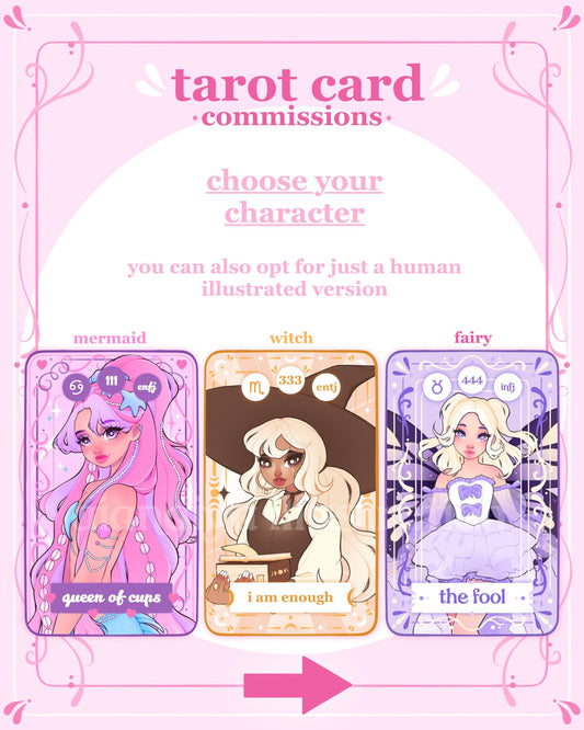 tarot card digital portrait commission, personalised fantasy character, witchy oc, fairy oc, custom bespoke drawing, digital illustration