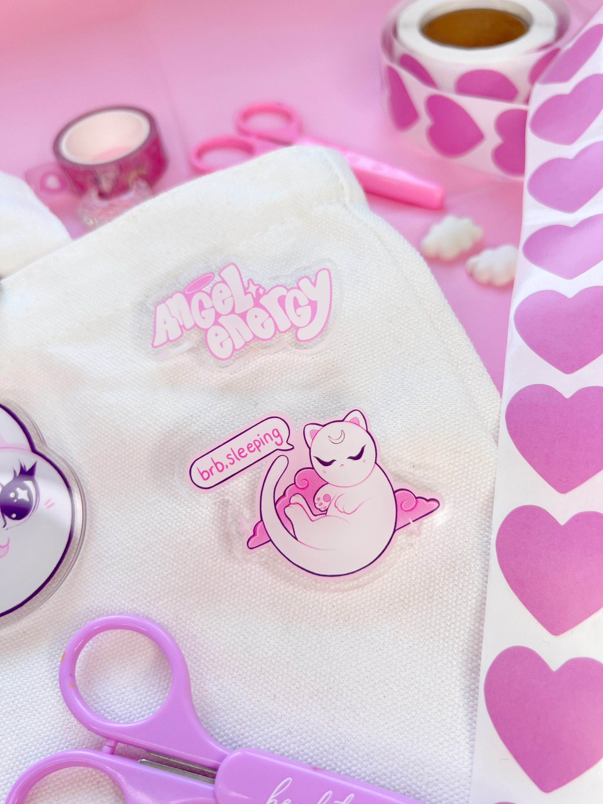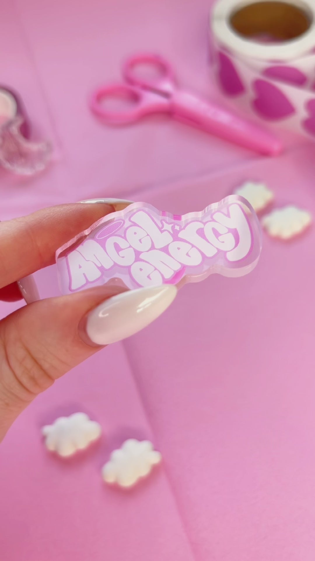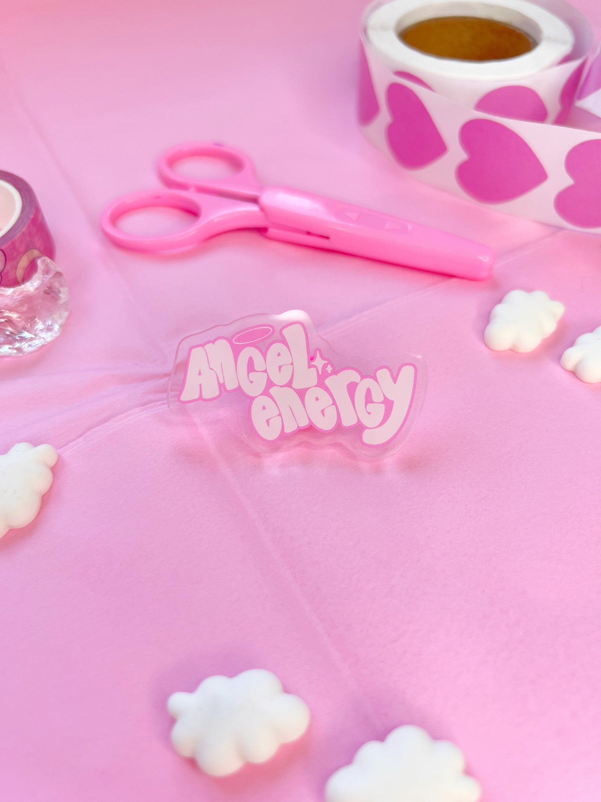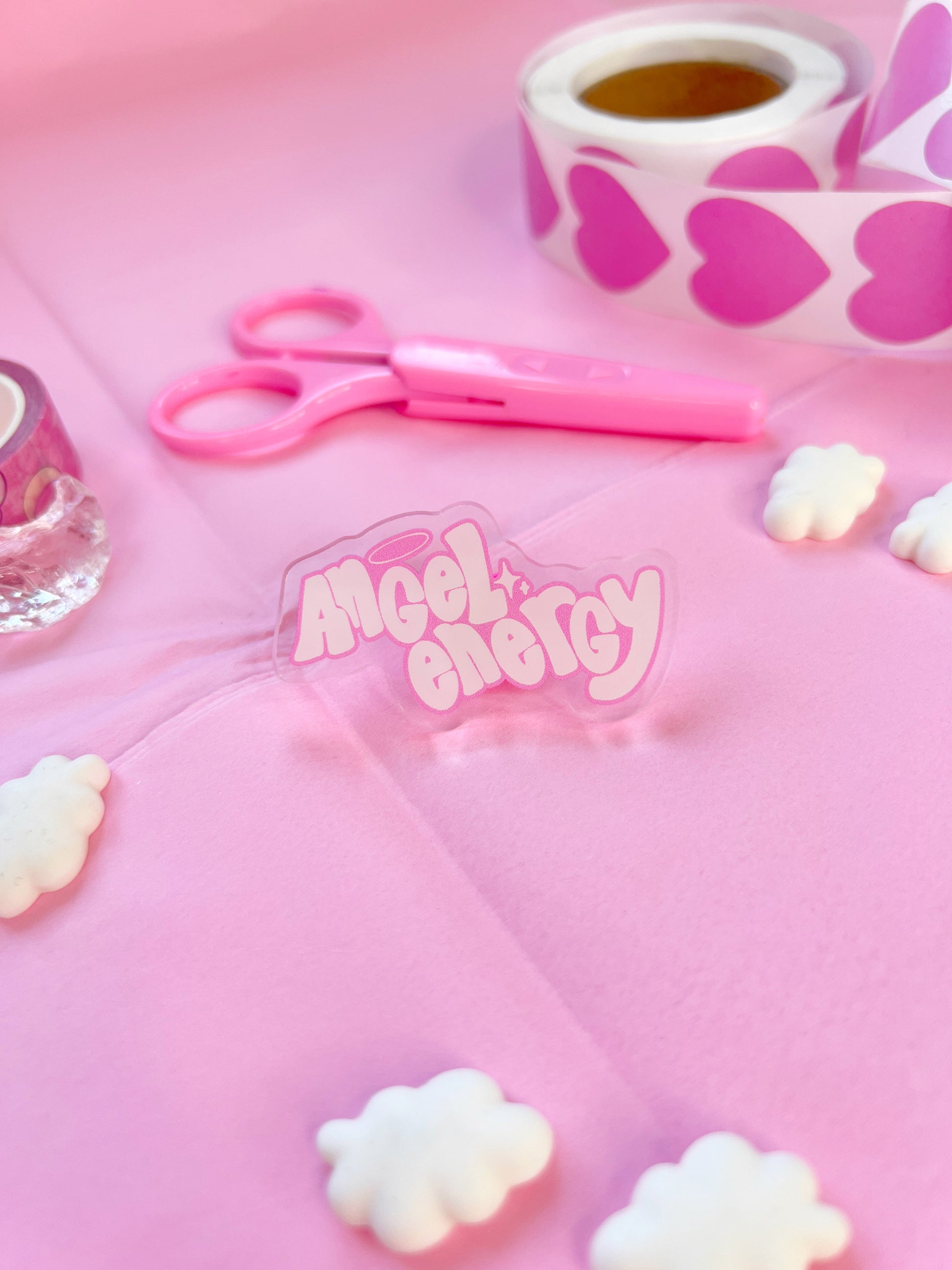 this is a super cute angel energy slogan acrylic pin!